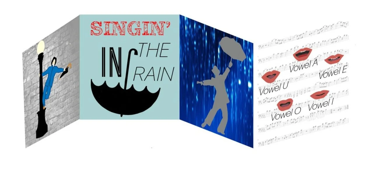 For the fourth and final fold, I really wanted to incorporate a piece of sheet music from the show. I used the sheet music as the background, bringing down the opacity so it’s not the main focus or overpowering the main design. In the movie there is a scene where they hold up cards with the way a mouth looks saying each vowel. I took each of those putting the mouth shapes in a circle and labeling each one.